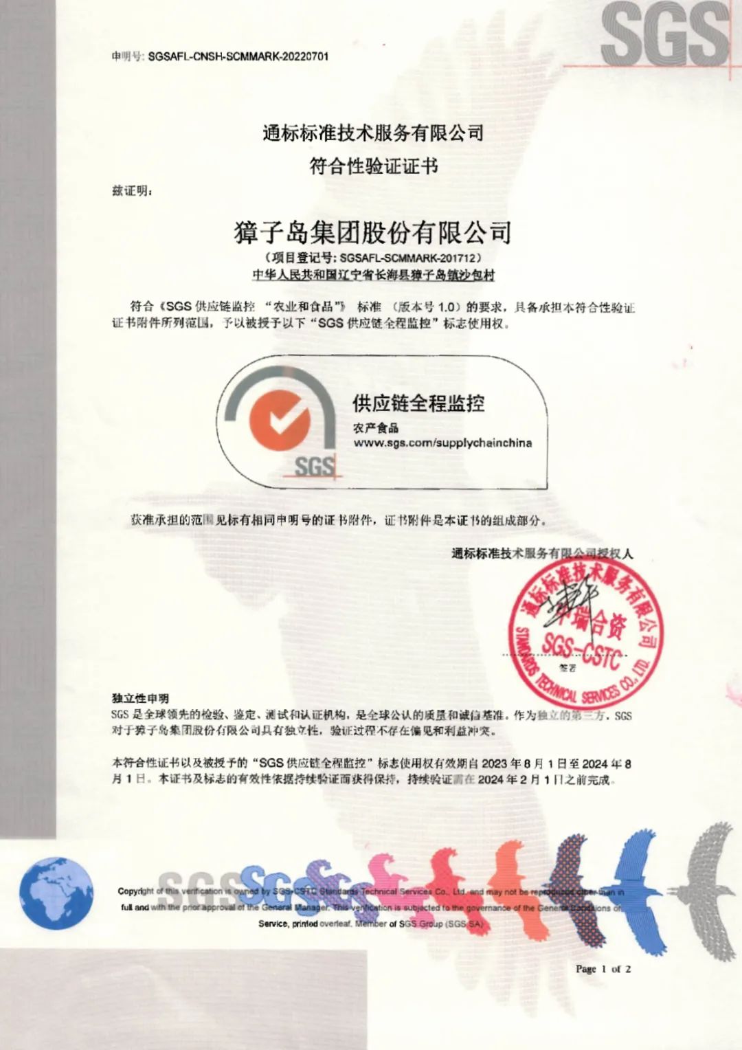 2023年8月1日獐子島集團順利取得SGS SCM MARK(SGS供應(yīng)鏈全程監(jiān)控)授權(quán)證書,標志著獐子島集團申請認證范圍內(nèi)的原料基地、加工廠、物流及銷售終端的管理及加工的海參制品,自2018年首次取得SGS SCM MARK授權(quán)以來連續(xù)6年滿足SGS SCM MARK標準要求。獐子島海參也成為全球唯一取得SGS SCM MARK授權(quán)使用的水產(chǎn)品。
