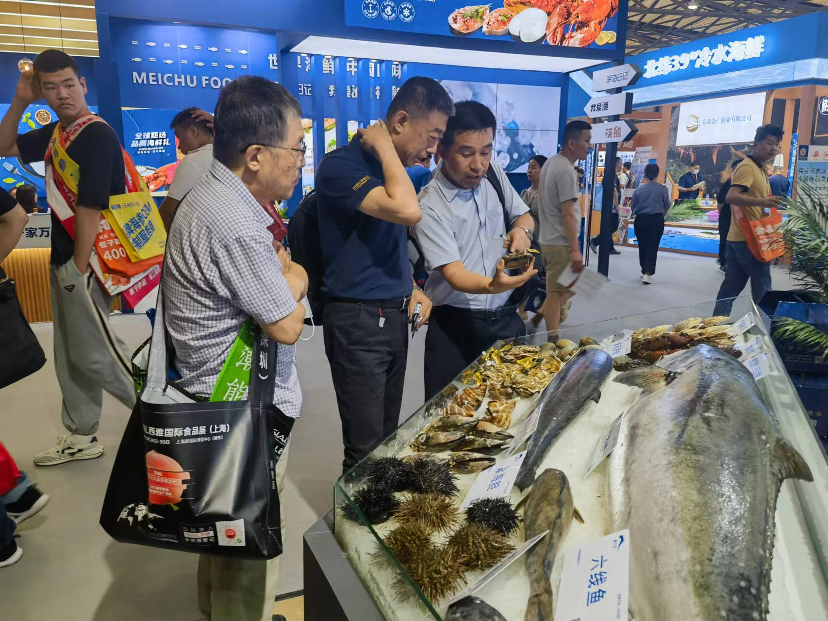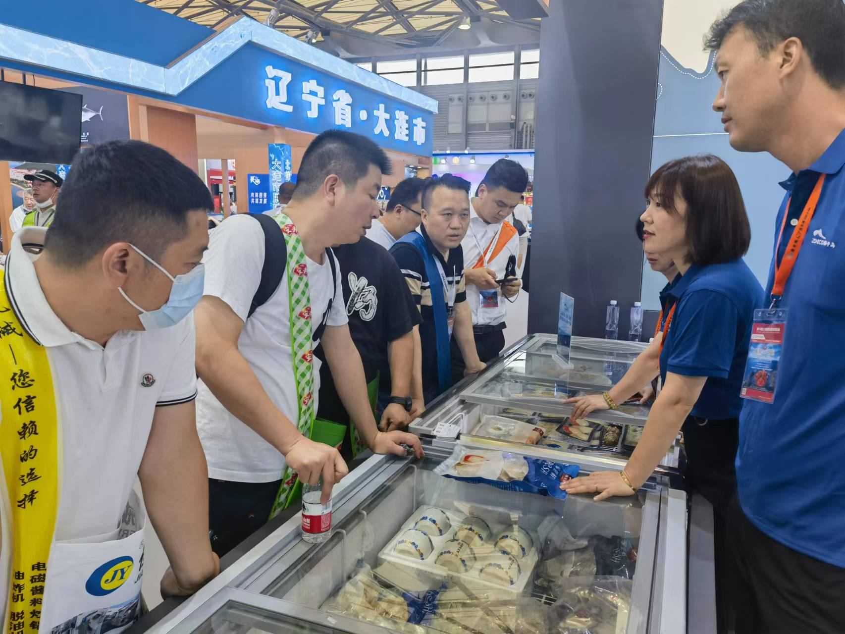 獐子島集團展位前人頭攢動,琳瑯滿目的展品包括刺參系列、冷水活鮮系列、海洋預(yù)制菜系列、魚子醬系列等產(chǎn)品集體亮相。憑借著獐子島的高端品質(zhì)、品牌影響力和豐富品類,吸引了眾多客商、同業(yè)洽談合作及交流學(xué)習(xí)。