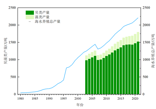 圖2 1980年~2021年中國(guó)海水養(yǎng)殖總產(chǎn)量及貝藻類產(chǎn)量