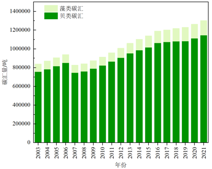 根據(jù)《中國(guó)漁業(yè)統(tǒng)計(jì)年鑒》所統(tǒng)計(jì)的中國(guó)人工大型經(jīng)濟(jì)海藻和貝類產(chǎn)量數(shù)據(jù),并利用參考文獻(xiàn)的估算結(jié)果并根據(jù)估算方法對(duì)貝、藻類產(chǎn)生的碳匯進(jìn)行估算, 2003年~2021年我國(guó)大型藻類年碳匯量為8.0萬(wàn)~15.6萬(wàn)t,貝類年碳匯量為76萬(wàn)~114萬(wàn)t,19年間貝藻類總碳匯量為1967萬(wàn)t,且呈現(xiàn)出逐年上升的趨勢(shì)(圖3)。如果被吸收的碳全部從大氣中獲得,則中國(guó)僅貝藻類養(yǎng)殖每年就可多從大氣中吸收約100萬(wàn)t以上的碳;如果我國(guó)貝海藻養(yǎng)殖產(chǎn)量每年按現(xiàn)有速度增加,那么貝藻類養(yǎng)殖將對(duì)增加大氣CO2的匯具有重要意義。2008~2015年我國(guó)各沿海省份(不包括臺(tái)灣和港澳地區(qū))貝藻類碳匯總量表現(xiàn)出山東省最高,其次是福建省和遼寧省,各沿海省份貝類碳匯量趨勢(shì)與貝藻類碳匯總量一致,藻類碳匯量為福建省最高,其次是山東省和遼寧?。粡V西省和河北省的碳匯轉(zhuǎn)化比最高;同時(shí)我國(guó)四個(gè)海域海水養(yǎng)殖業(yè)碳匯總量為黃海>東海>渤海、南海,但南海的碳匯轉(zhuǎn)化比最高。
