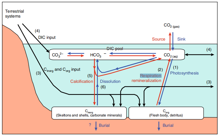 圖1 空氣-水-CO2交互的碳生物地球化學(xué)過(guò)程概念圖。藍(lán)線表示大氣CO2吸收的過(guò)程,紅線表示CO2排放到大氣中的過(guò)程。地表水中的CO2濃度主要決定通量的方向。地表水CO2濃度由溶解無(wú)機(jī)碳(DIC)中的碳酸鹽平衡決定,并受生態(tài)系統(tǒng)凈生產(chǎn)(光合作用、呼吸和再礦化的平衡)影響,直接調(diào)節(jié)DIC、外來(lái)顆粒物和溶解有機(jī)碳(Corg)、顆粒無(wú)機(jī)碳(Cinorg)以及來(lái)自陸地系統(tǒng)和沿海海洋的DIC輸入、凈Cinorg生產(chǎn)(鈣化和溶解的平衡),直接調(diào)節(jié) DIC 和總堿度(TA)和溫度(CO2溶解度)。鈣化作用產(chǎn)生的 CO2在正常海水中的比例(釋放的CO2/沉淀的 Cinorg)約為 0.6 。