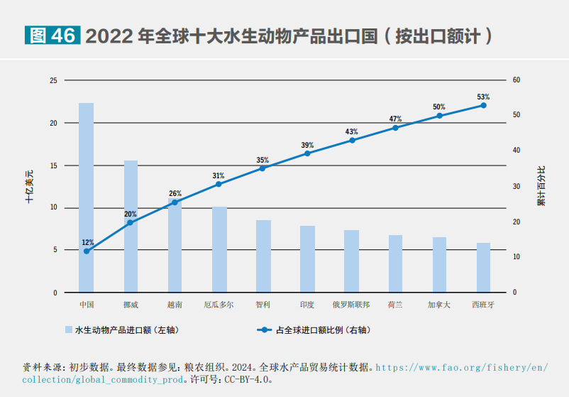 2022 年全球十大水生動(dòng)物產(chǎn)品出口國(guó)(按出口額計(jì))。?糧農(nóng)組織