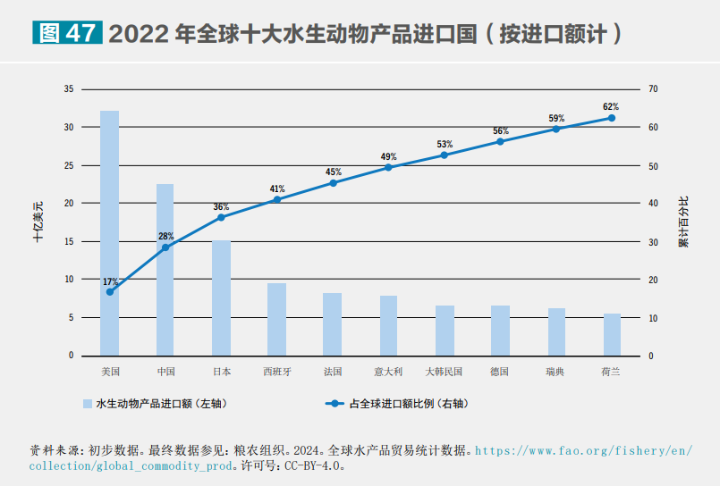 2022 年全球十大水生動(dòng)物產(chǎn)品進(jìn)口國(guó)(按進(jìn)口額計(jì))。?糧農(nóng)組織