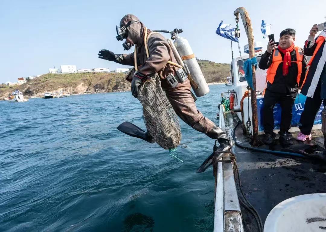冬捕節(jié)當天,漁民們載歌載舞唱響了冬捕節(jié)主題曲《采參謠》,傳遞著豐收的喜悅。20余名潛水員的鄭重宣誓:“感恩生態(tài),限量采捕”,表達了獐子島人對海洋始終懷有敬畏之心、感恩之情。伴著剛勁渾厚、鏗鏘有力的長海號子,全副武裝的潛水員們分乘30余艘漁船劈波斬浪、乘風出海,直奔當日源刺參采捕地——獐子島馬牙灘海域。