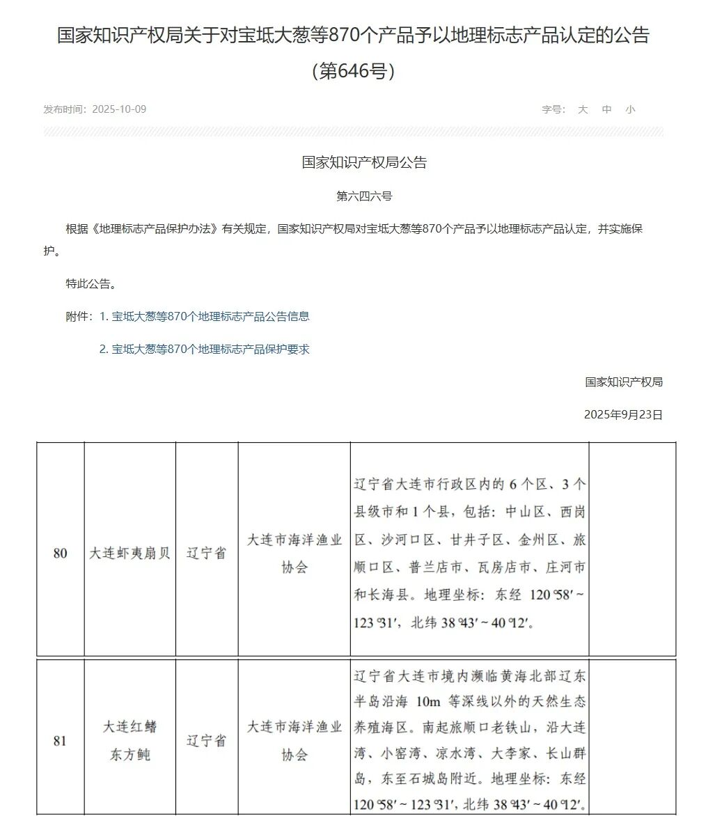 10月9日,國家知識(shí)產(chǎn)權(quán)局發(fā)布公告:依據(jù)《地理標(biāo)志產(chǎn)品保護(hù)辦法》,全國870個(gè)產(chǎn)品新晉“國家地理標(biāo)志產(chǎn)品”,其中“大連蝦夷扇貝”“大連紅鰭東方鲀”雙雙入選。這意味著,大連人引以為傲的兩大“海鮮明星”,不僅有了國家官方認(rèn)證的“身份標(biāo)識(shí)”,更將以更優(yōu)品質(zhì)、更規(guī)范的市場環(huán)境,端上更多家庭的餐桌。