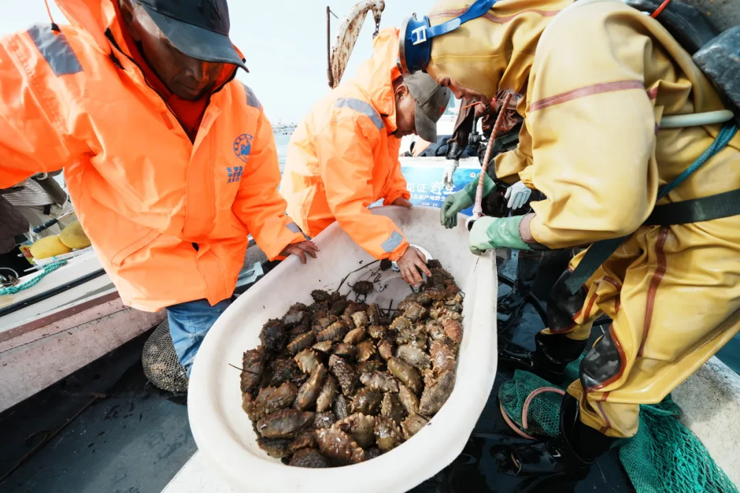 馬牙灘海域位于獐子島西北側(cè),是大連地區(qū)罕有的野生源刺參核心產(chǎn)區(qū)。近50名潛水員整理裝備后傾身入海,約十分鐘后相繼浮出水面,每人手中滿載著20余斤源刺參。船上工作人員立即進(jìn)行現(xiàn)場(chǎng)分揀,并詳細(xì)記錄采捕時(shí)間、海域、船號(hào)、潛水員及海參數(shù)量等信息,為原產(chǎn)地二維碼追溯體系提供精準(zhǔn)數(shù)據(jù)支撐。