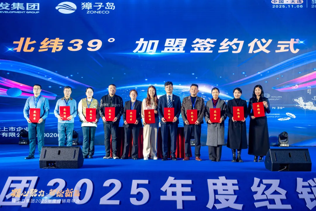 在經(jīng)銷商年會(huì)上,獐子島集團(tuán)隆重進(jìn)行了北緯39°品牌的啟動(dòng)亮相儀式。在海發(fā)集團(tuán)副總經(jīng)理高鵬,獐子島集團(tuán)總裁路珂、副總裁劉明以及兩位經(jīng)銷商代表的共同推動(dòng)下,北緯39°品牌正式啟幕,這一時(shí)刻標(biāo)志著獐子島集團(tuán)在新征程上邁出了堅(jiān)實(shí)且關(guān)鍵的一步,開啟品牌發(fā)展的全新篇章。10位滿懷激情與創(chuàng)造力的新加盟商與獐子島集團(tuán)成功簽約,成為北緯39°品牌首批經(jīng)銷商。他們的加入,為品牌注入了鮮活的生命力與源源不斷的新鮮血液,有力地拓寬了市場版圖,讓獐子島集團(tuán)的發(fā)展藍(lán)圖愈發(fā)廣闊清晰。