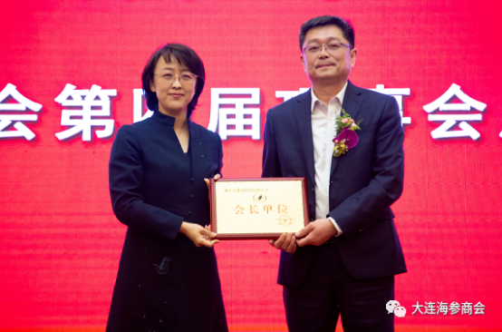 大連市工商業(yè)聯(lián)合會副主席、大連市總商會副會長劉琳為大連海參商會會長戰(zhàn)成敏授匾